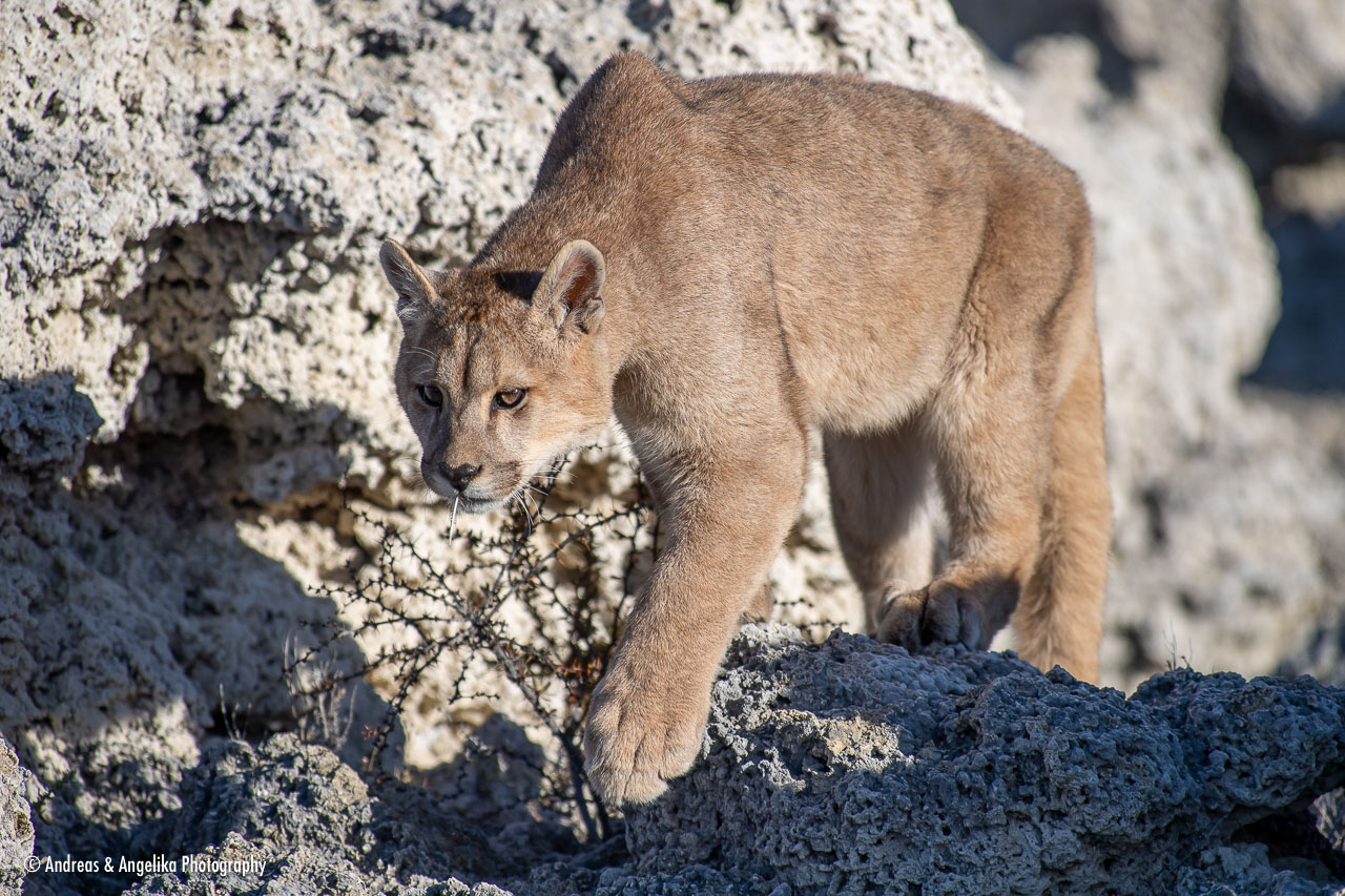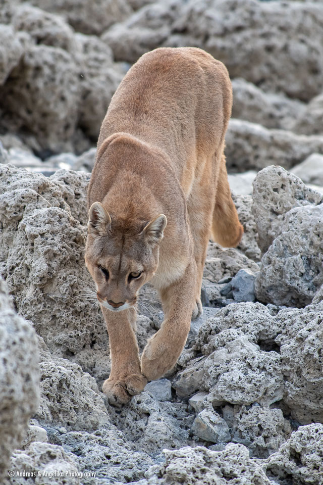 Puma Tracking in Torres del Paine ⎯ "Pluma" strolling through the stromatolite landscape of Lago Sarmiento.