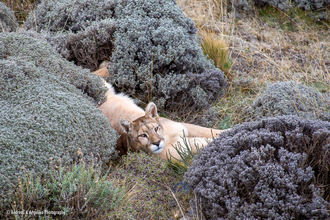 Puma Tracking in Torres del Paine ⎯ "Amber" in her hiding place on the shore of Laguna Goic.