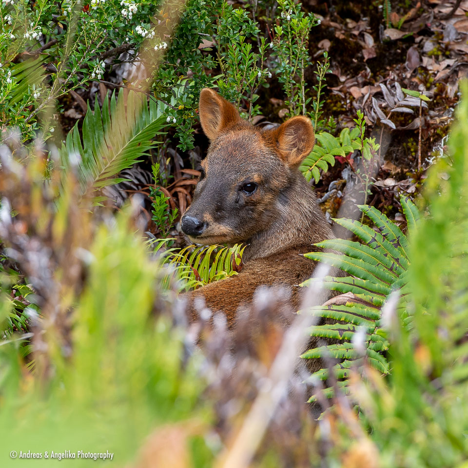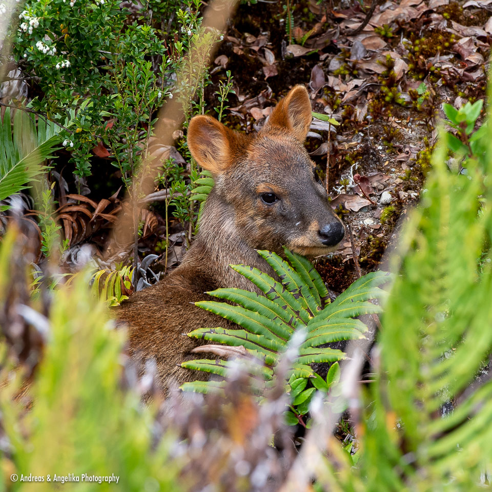 Trip to Chiloé and Puelo ⎯ Baby Southern Pudú (Pudu puda) hiding in the scrub, Tantauco Park, Chiloé