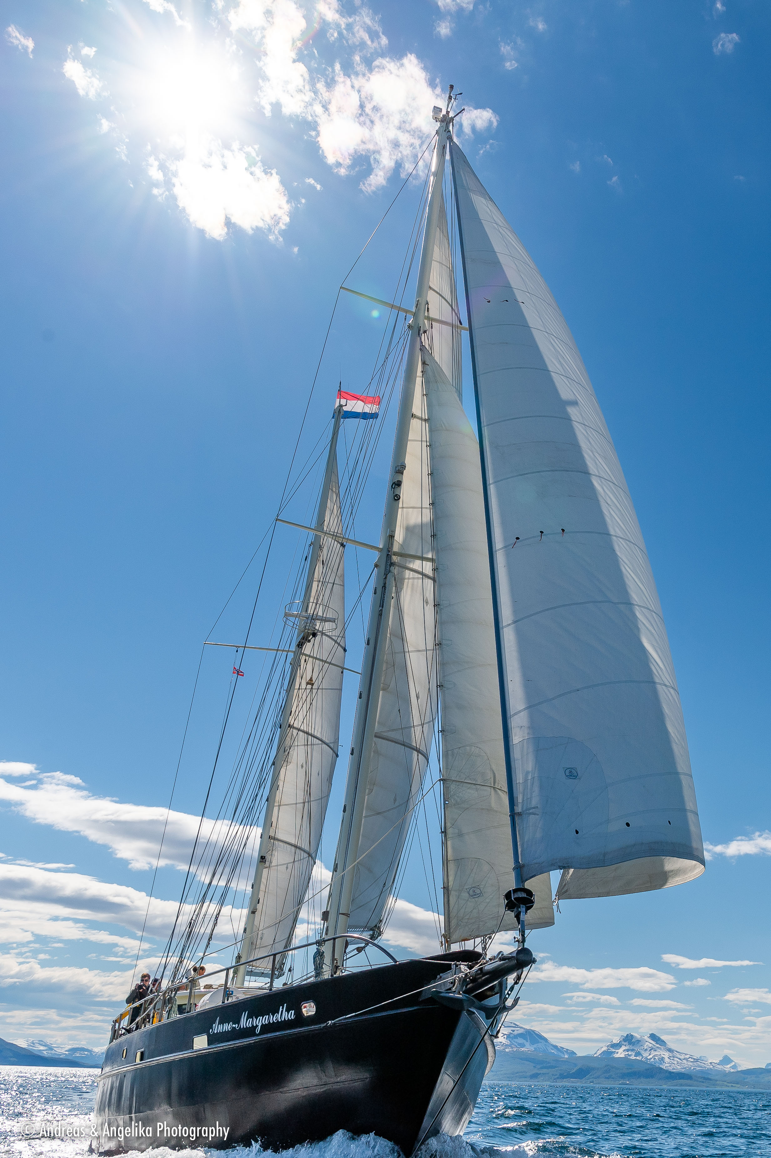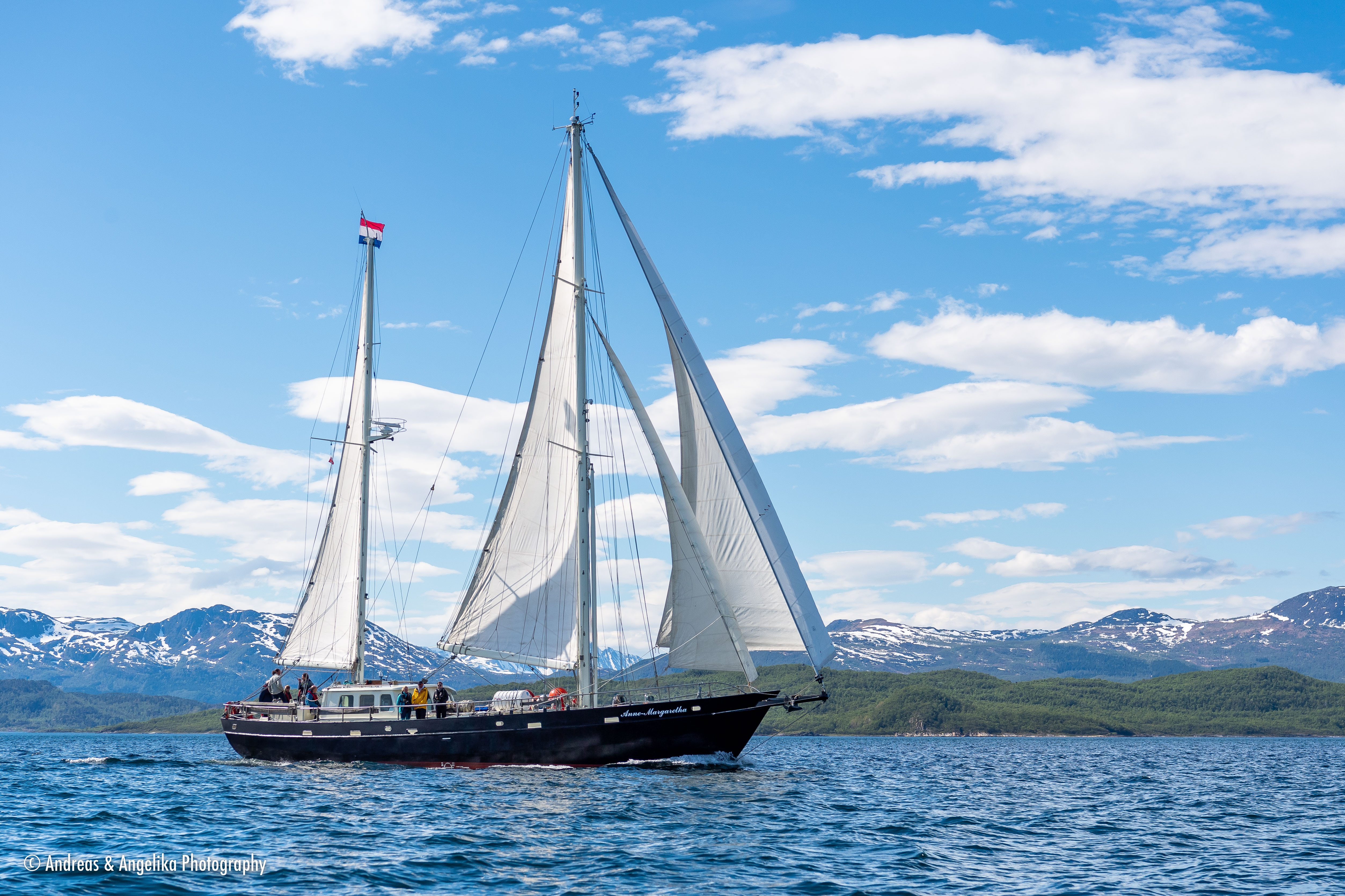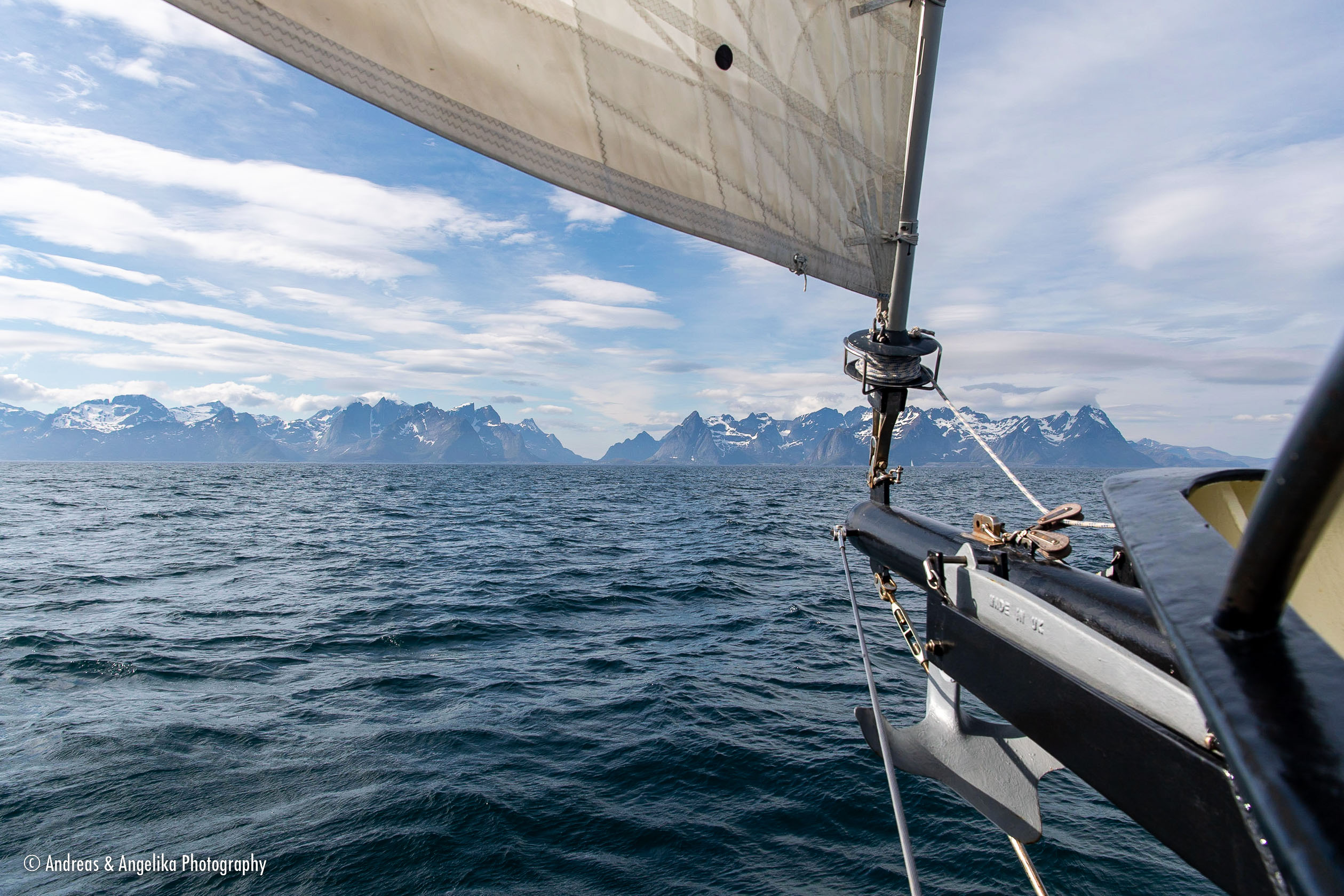 Tour from Tromsø to Bodø by car and back via the Lofoten islands with the Anna-Margaretha. ⎯ Anne-Margaretha under sails near Dyngenest, Troms, Norway