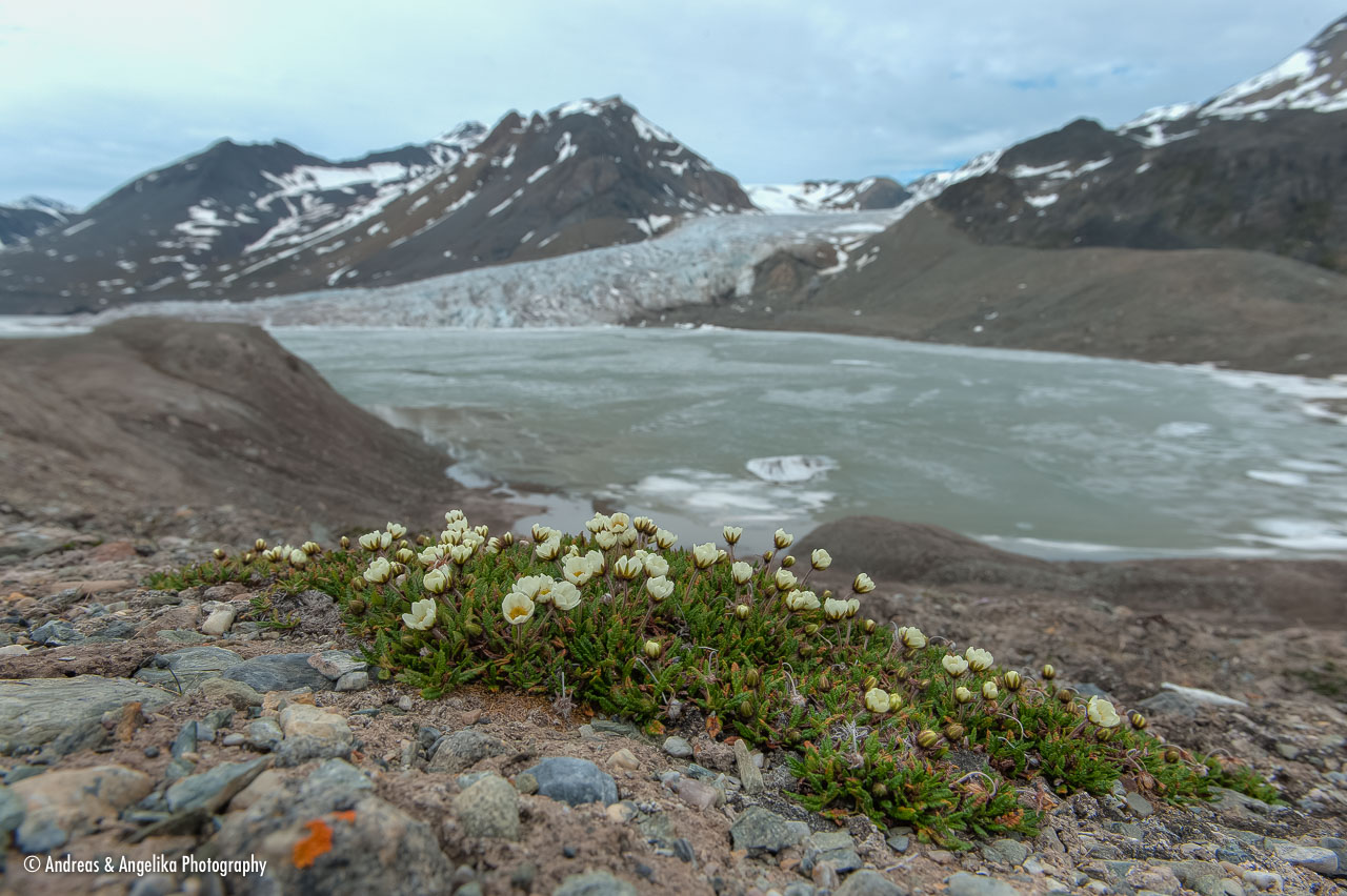 Mountain avens (Dryas octopetala) on Hornbækpollen with Erikbreen Glacier in the background
