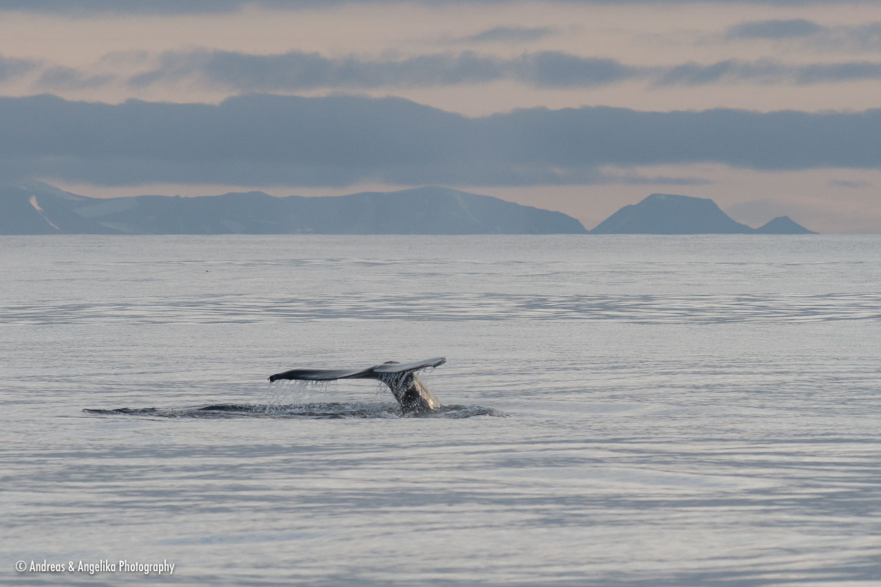 Humpback Whale (Megaptera novaeangliae) diving in the Storfjord at Midnight
