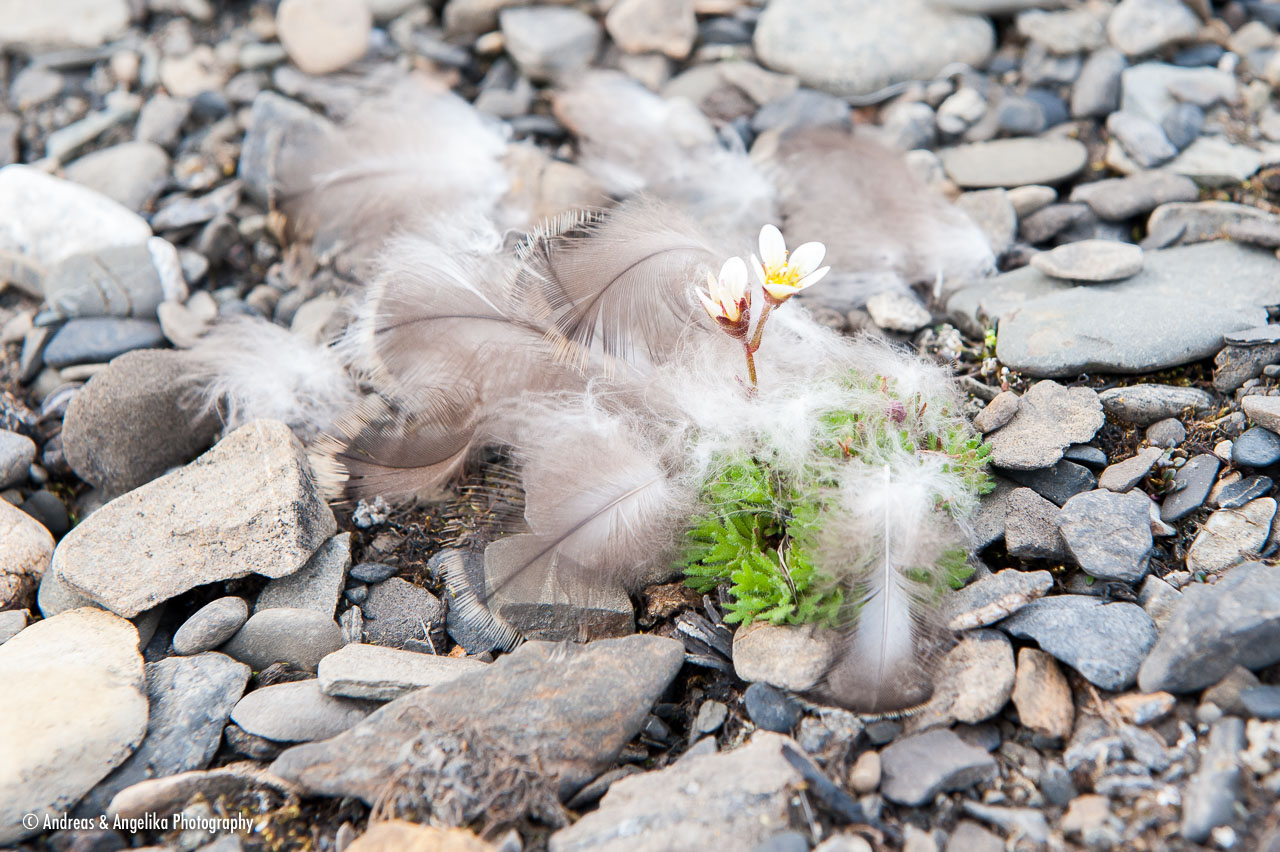 Tufted Saxifrage (Saxifraga cespitosa) on Blomstrandhalvøya with Eider feathers at Ahlstrandhalvøya