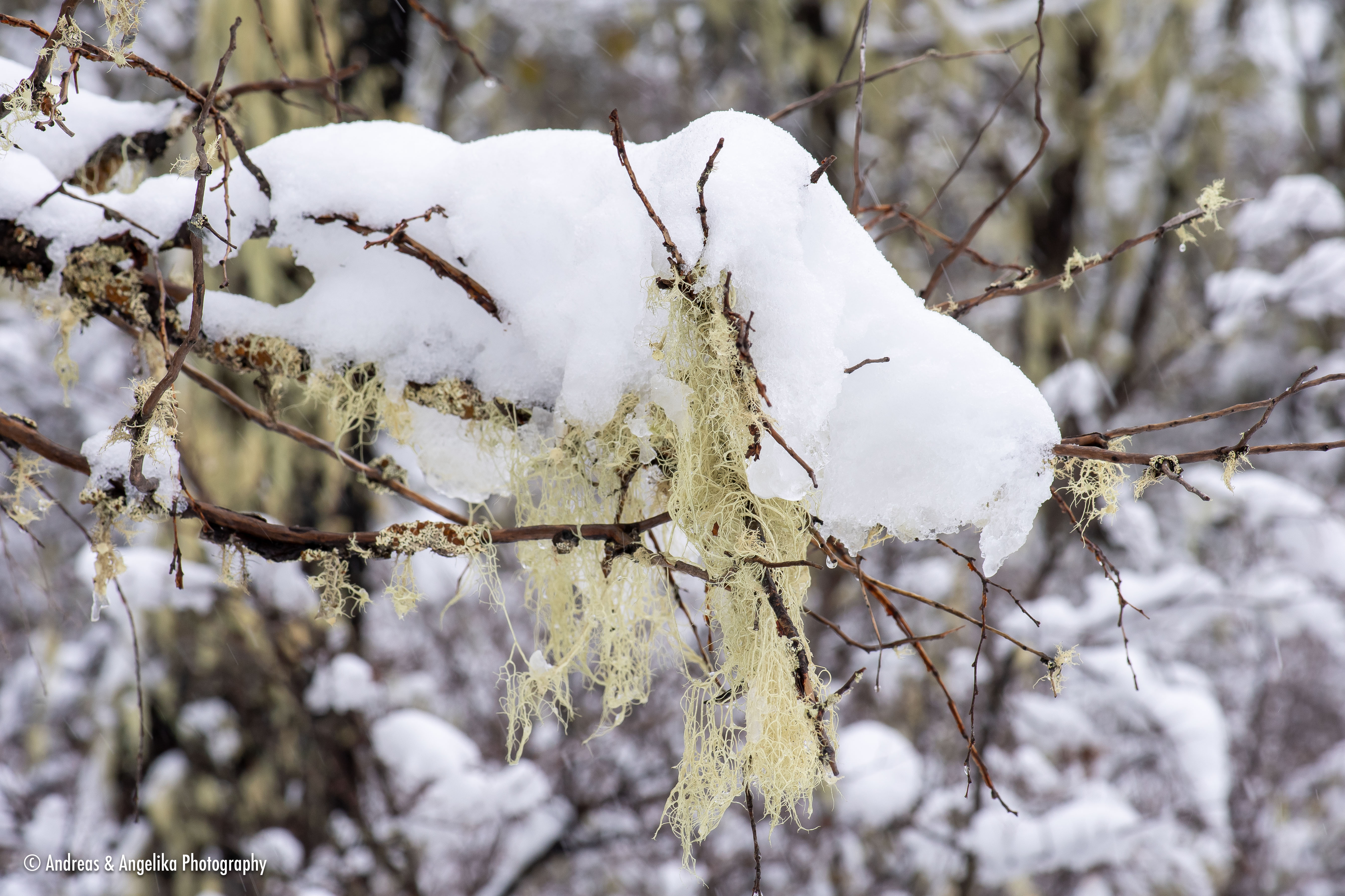 Barba de viejo (Protousnea magellanica) covered with snow